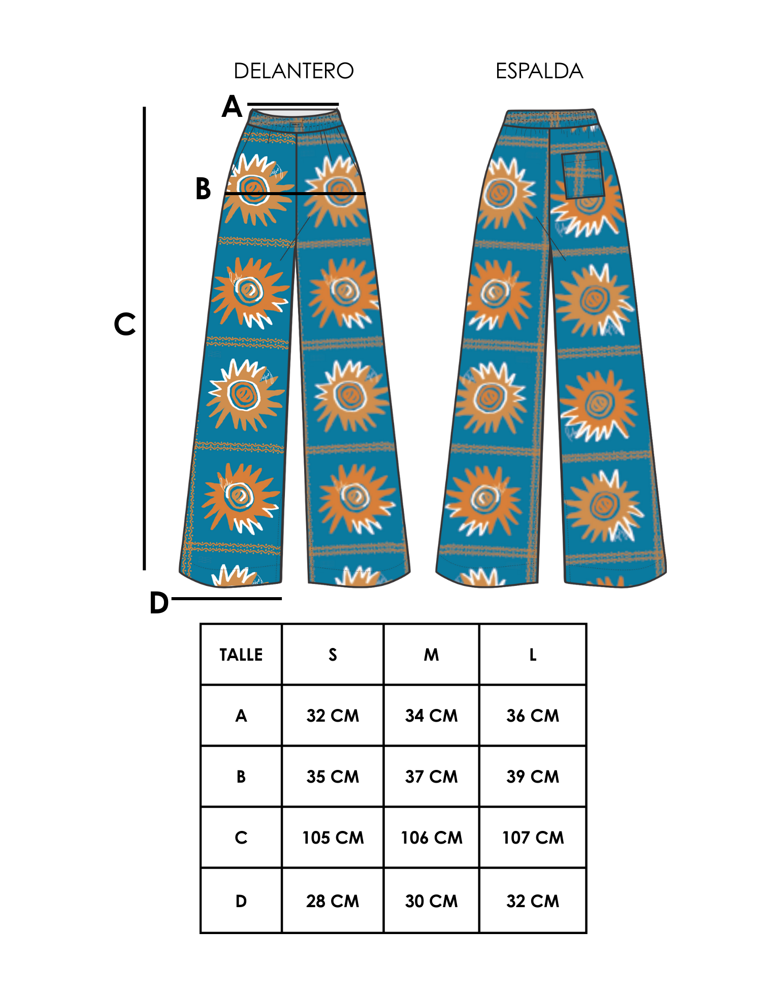 El sol en la cultura india es fuente de vida, energía y renovación. Este pantalón toma esa esencia en la estampa y la transforma en una prenda que irradia fuerza, calidez y presencia. Para ellas que caminan con brillo propio. Su orientacion de estructura vertical estiliza cualquier pierna.