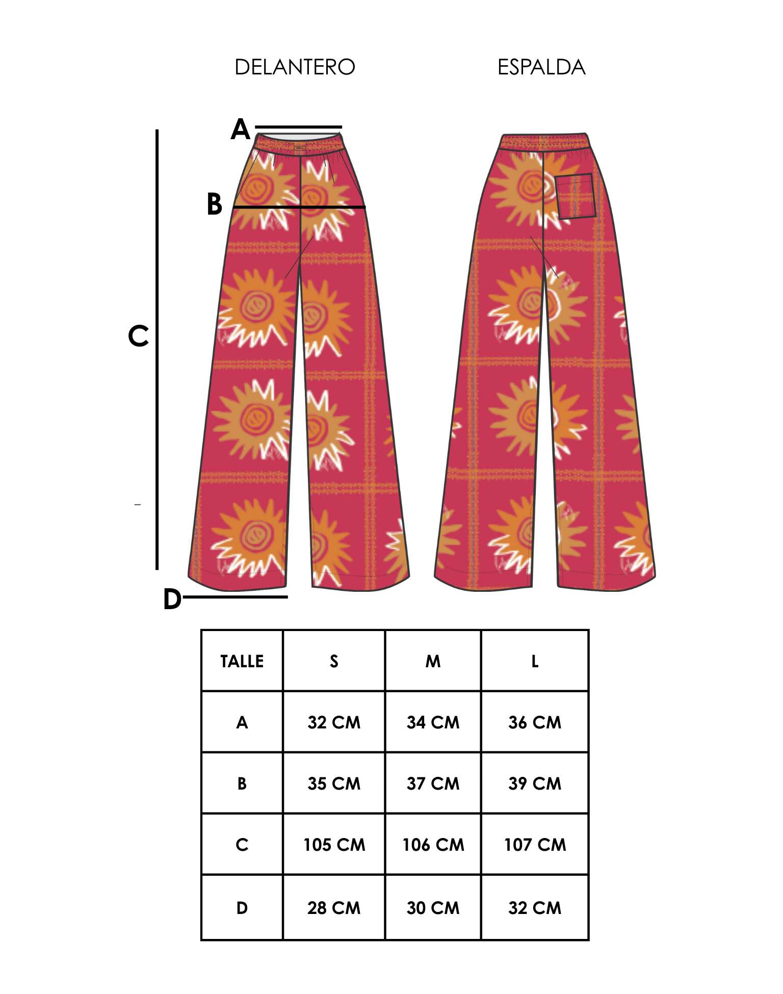 El sol en la cultura india es fuente de vida, energía y renovación. Este pantalón toma esa esencia en la estampa y la transforma en una prenda que irradia fuerza, calidez y presencia. Para ellas que caminan con brillo propio. Su orientacion de estructura vertical estiliza cualquier pierna.