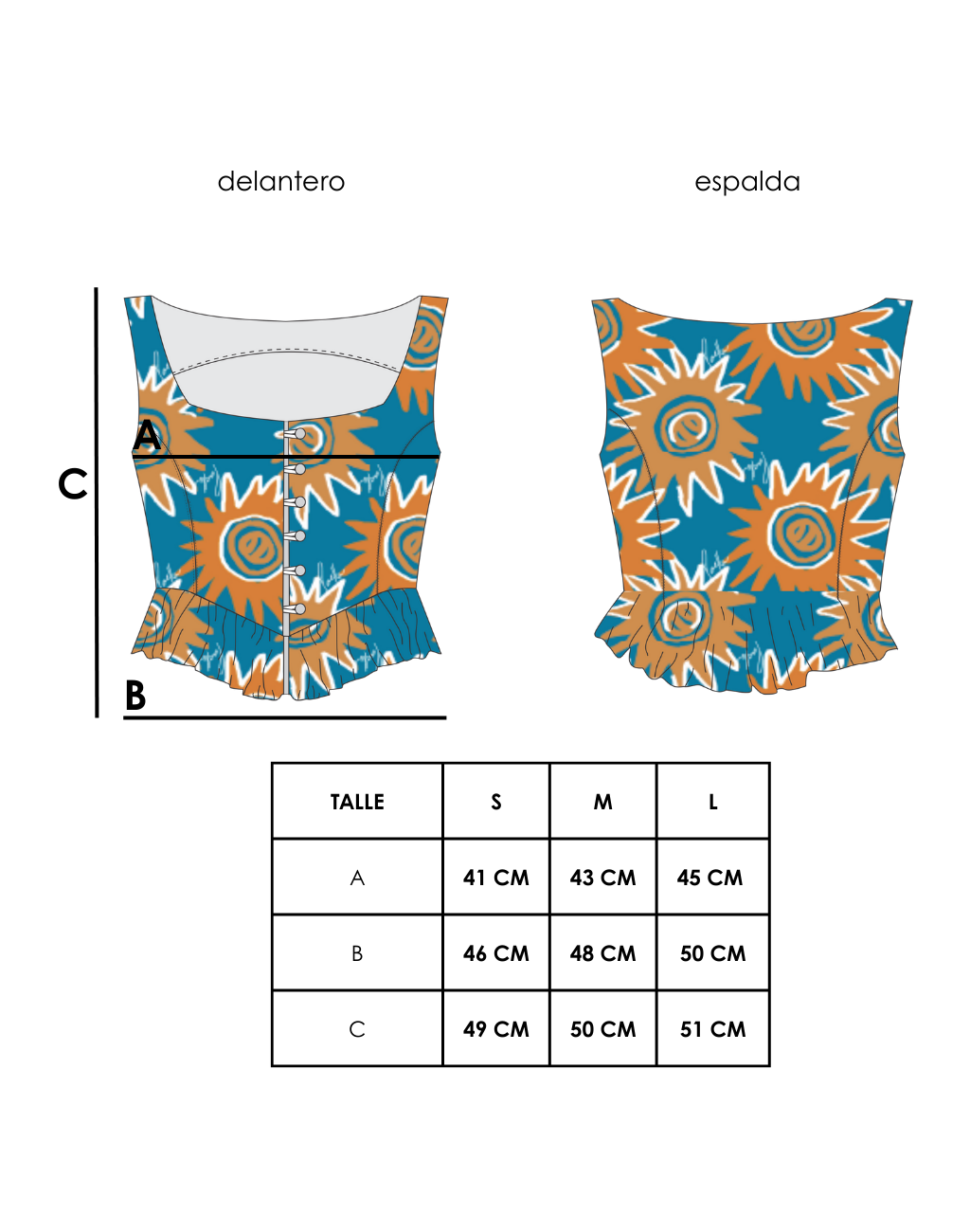 Los soles en tonos naranjas sobre un fondo celeste intenso genera un contraste increible y una combinación poderosa, sin duda pensada para destacar. Un top pensado para las que aman los looks con personalidad.
