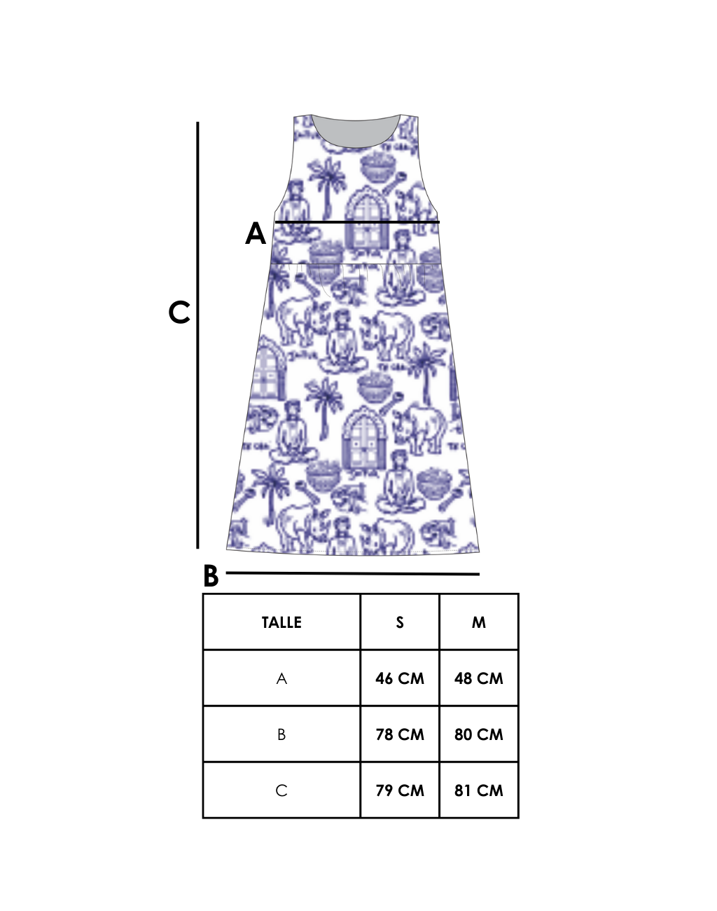 El vestido más canchero, su estampa es protagonista, ilustraciones silumando un boceto en azul tinta sobre fondo crudo, un clásico monocromo que nunca falla y que le da ese aire artesanal, bohemio y sofisticado. Cada dibujo está inspirado en escenas cotidianas de India, flores, templos, vasijas y animales.