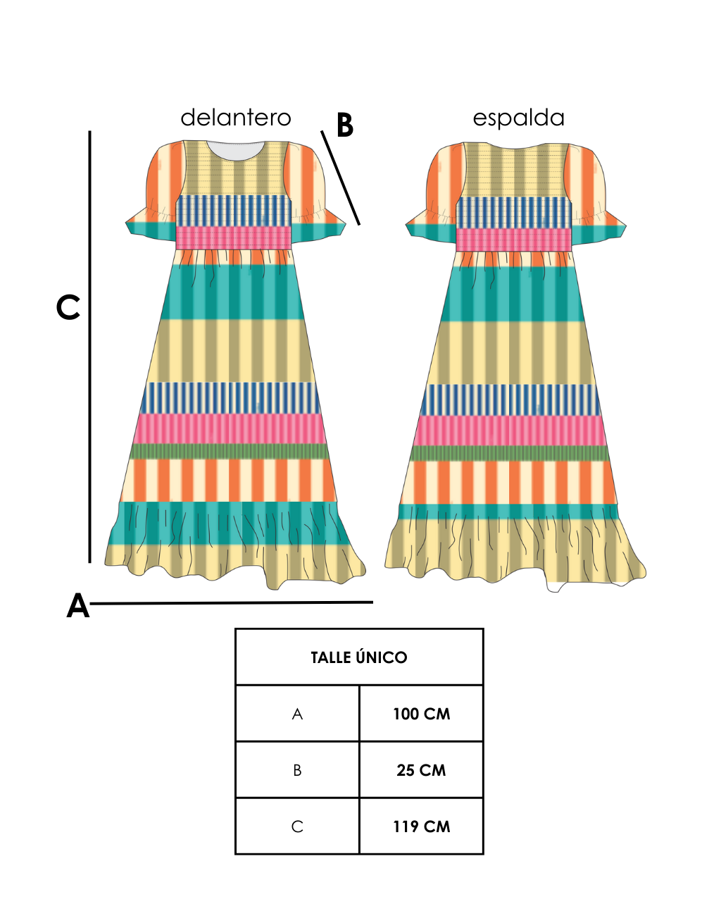 La estampa combina rayas de color que gritan verano, naranja, turquesa, amarillo, verde, rosa, azul. Está diseñado a partir de bloques de color, en donde van conviviendo distintos, grosores y formatos de lineas, generando un efecto visual con un recorrdo súper dinámico. Su orientacion vertical es un aliado perfecto para las que buscan estilizar la figura. Es sin duda una estampa pensada para destacar.