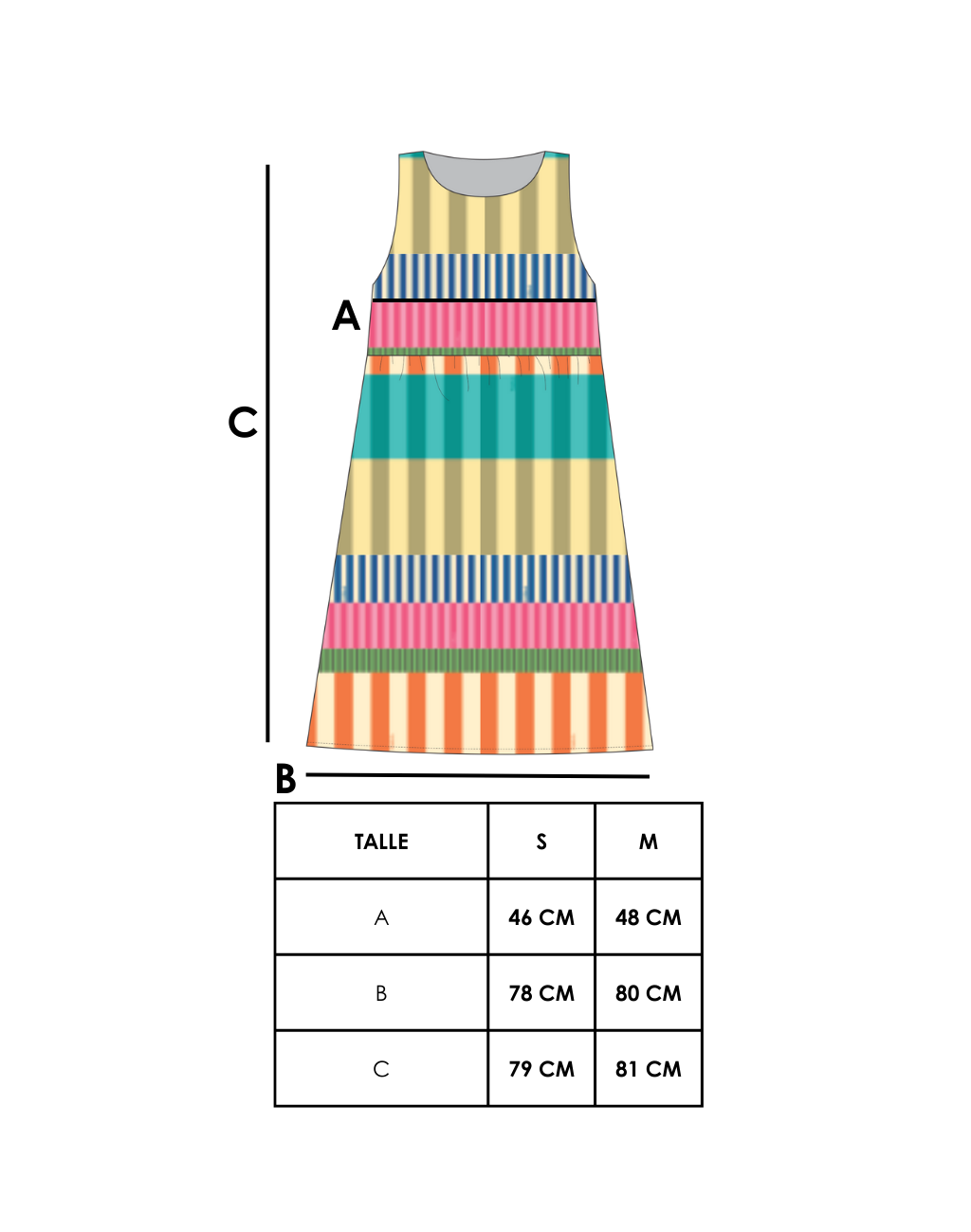 Un vestido pensado para destacar, con una estampa de rayas multicolor inspirada en el verano: naranja, turquesa, amarillo, verde, rosa y azul. Diseñado a partir de bloques de color con distintos grosores y formatos de líneas que crean un efecto visual dinámico y moderno. Su orientación vertical estiliza la figura y realza la silueta.